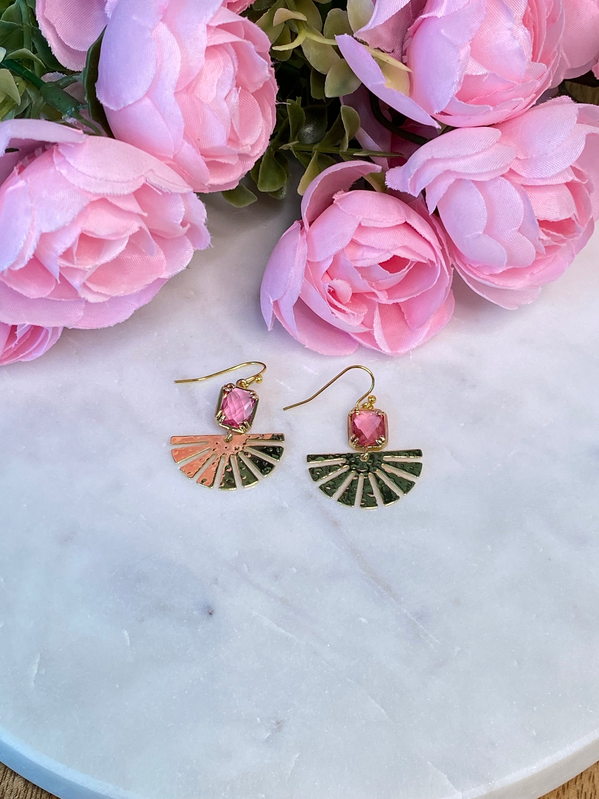 Romantic and radiant, these pink gemstone drops are framed in warm gold and finished with a sculptural fan silhouette.